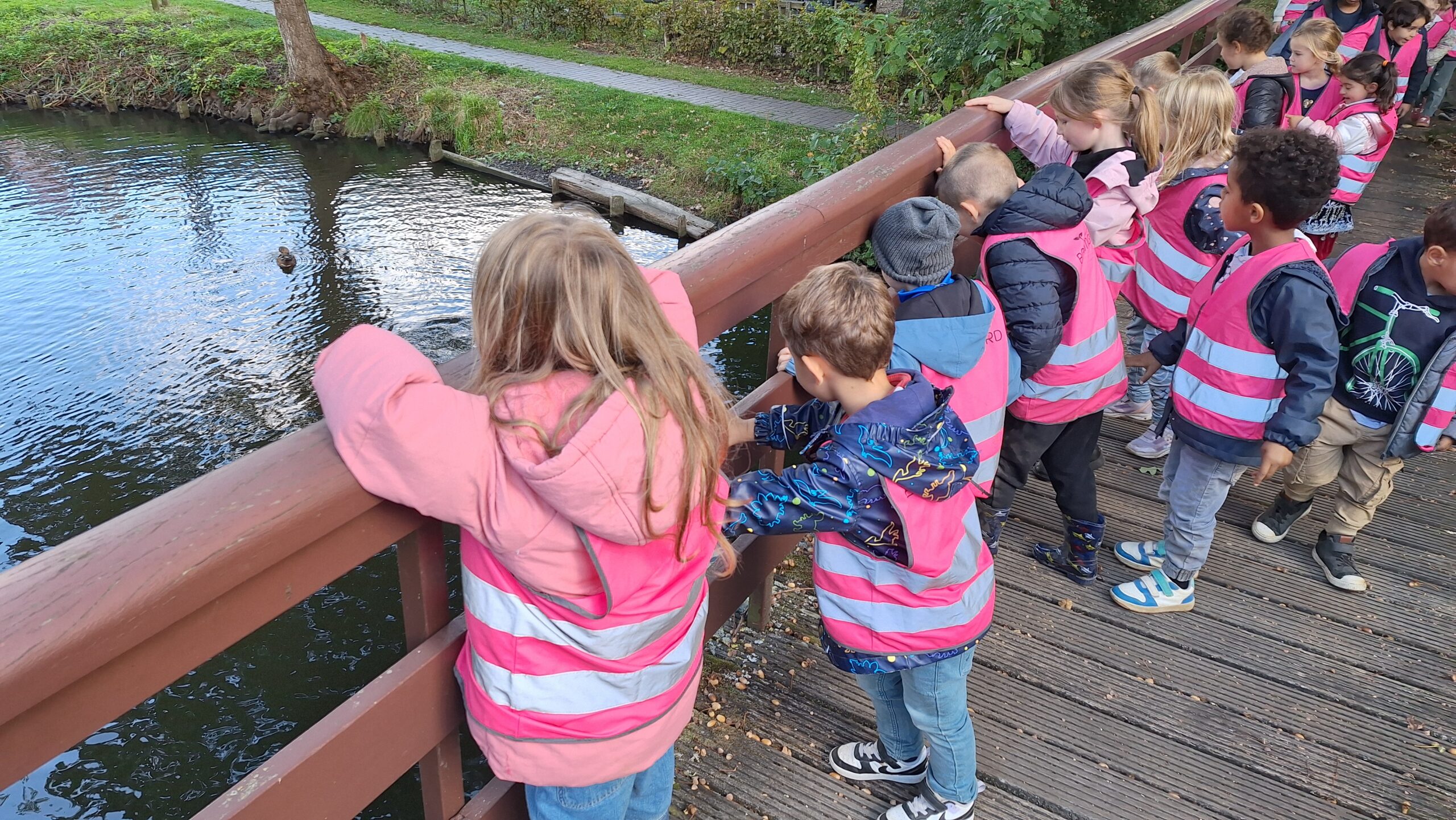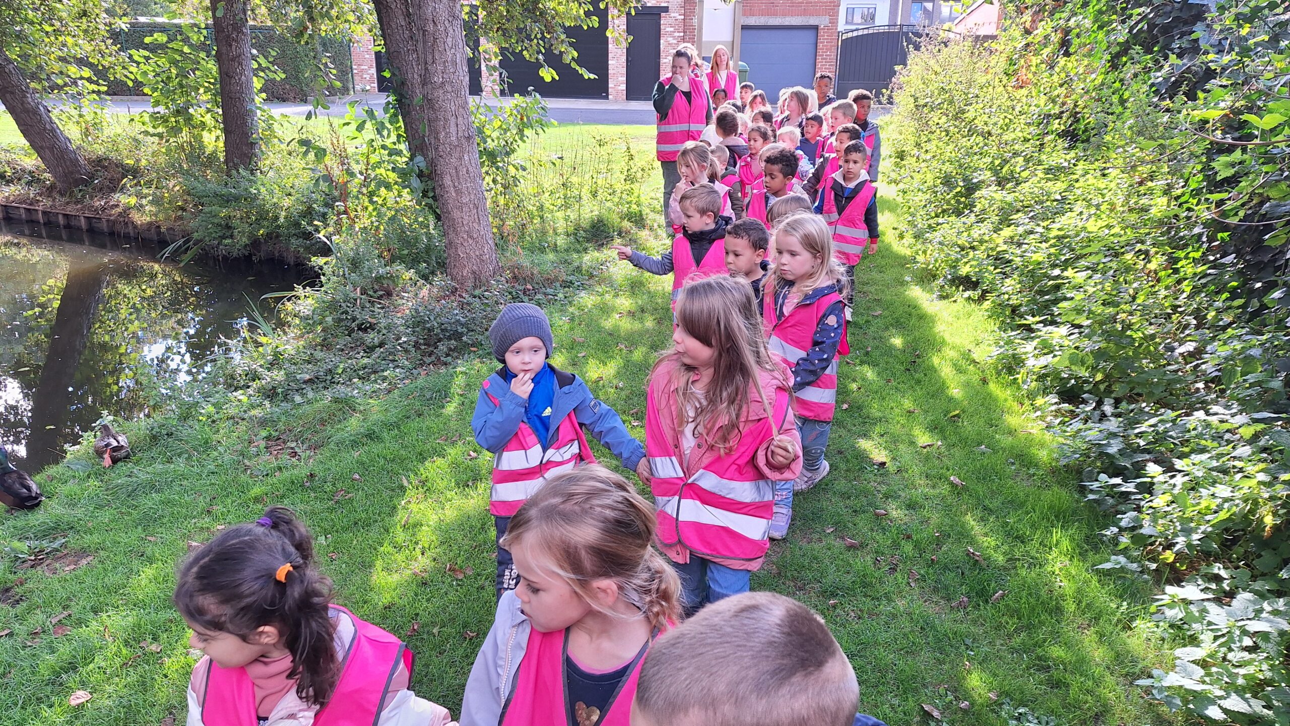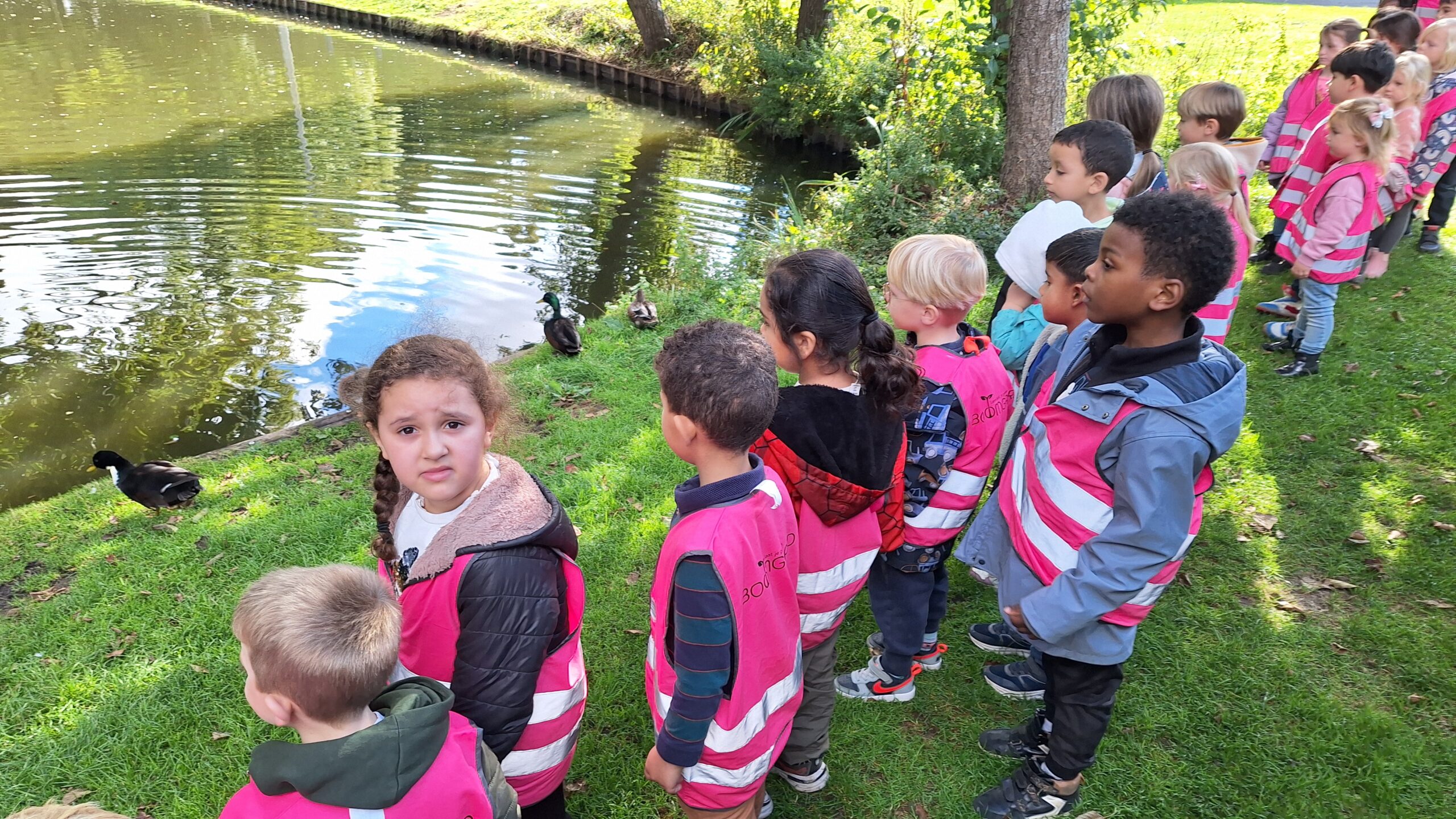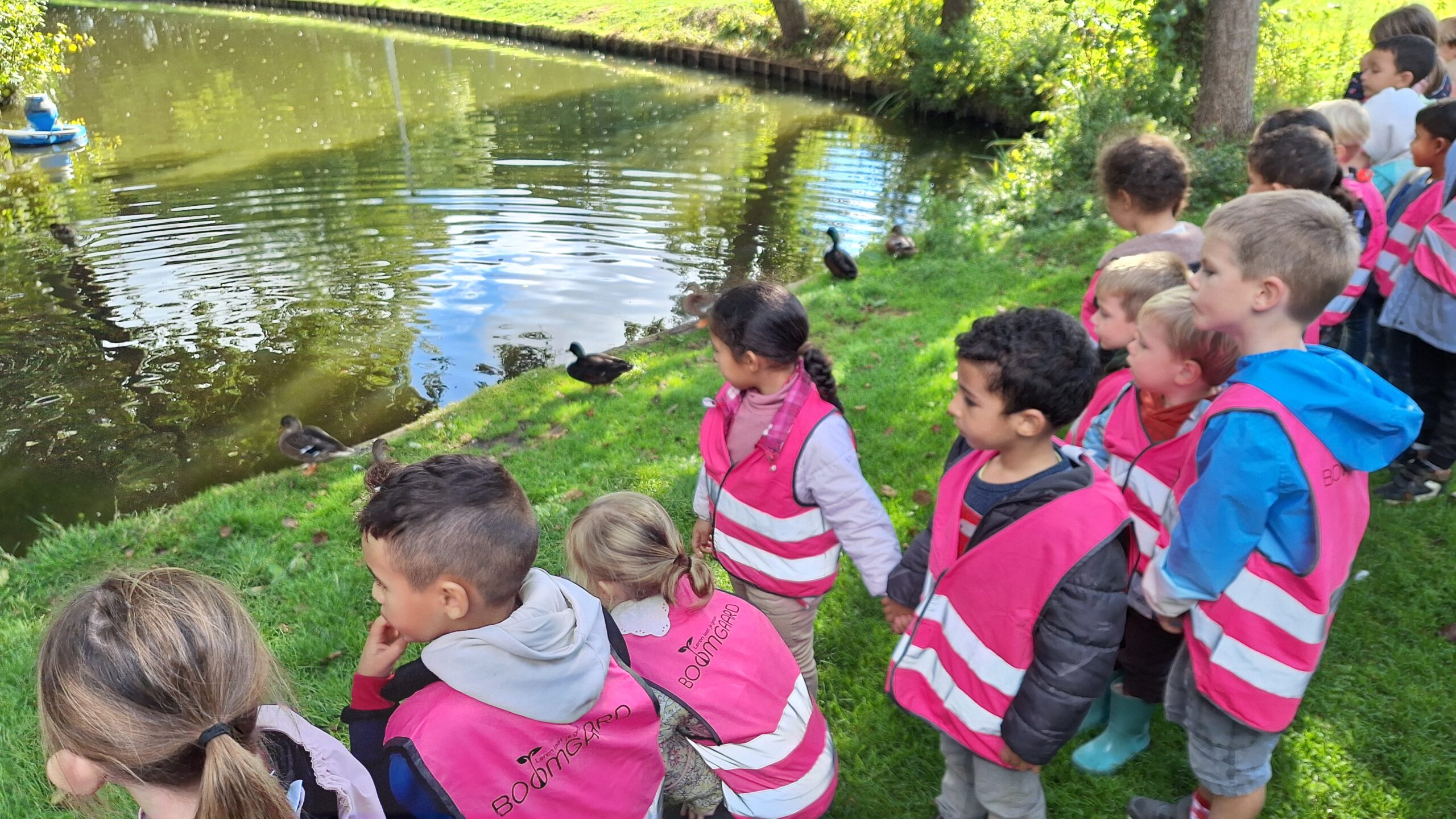Waar de kleuters het meest naar uitkeken was onze uitstap op dinsdag naar een echte vijver. De kinderen keken vol verwondering naar wat er allemaal te zien was: eenden, planten, water en een gans. Zo werd het thema nog echter en konden ze zelf ervaren hoe een vijver er in het echt uitziet.
