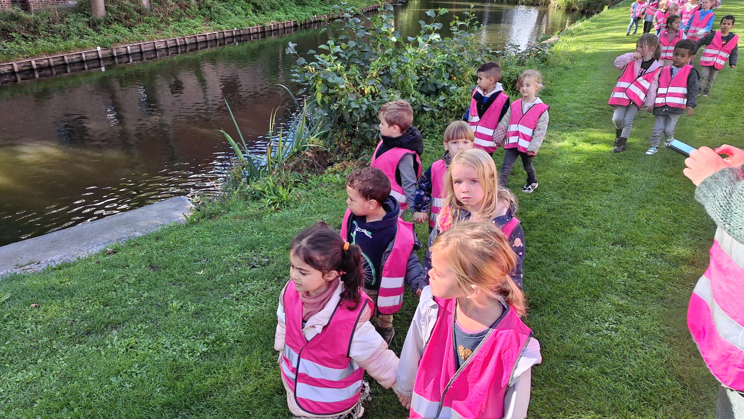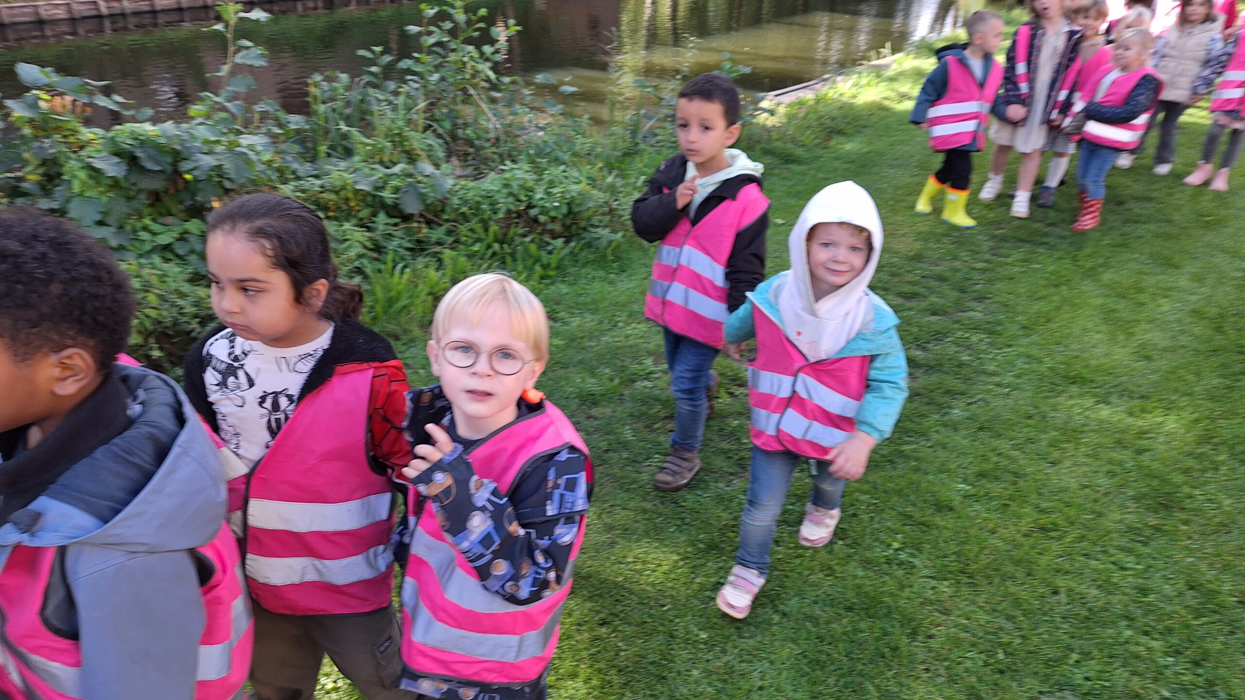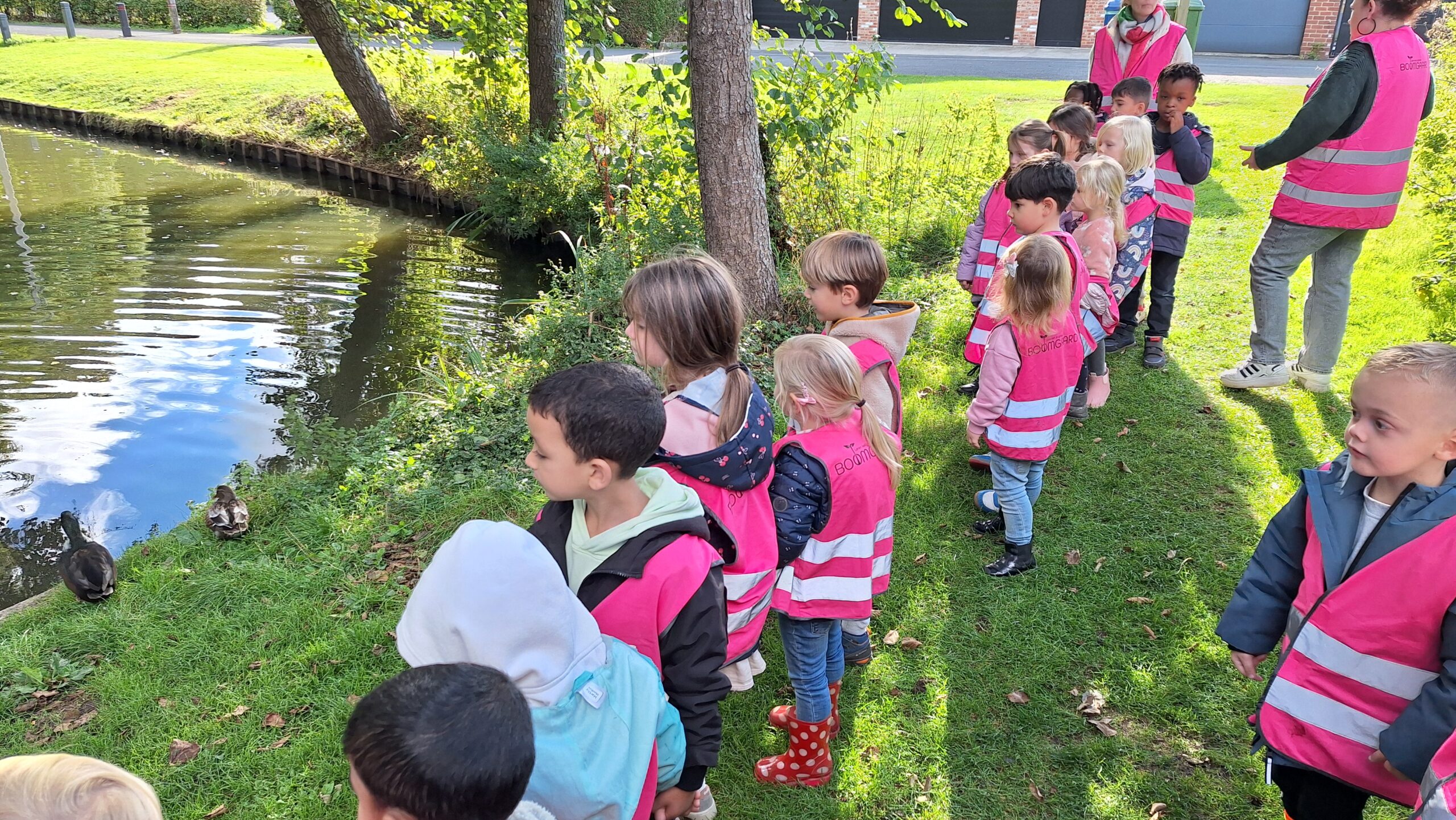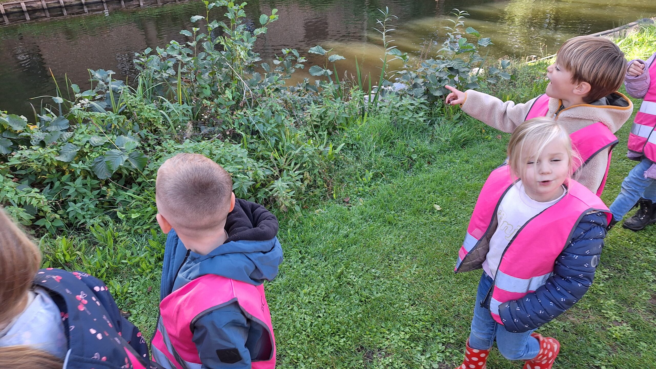 Waar de kleuters het meest naar uitkeken was onze uitstap op dinsdag naar een echte vijver. De kinderen keken vol verwondering naar wat er allemaal te zien was: eenden, planten, water en een gans. Zo werd het thema nog echter en konden ze zelf ervaren hoe een vijver er in het echt uitziet.