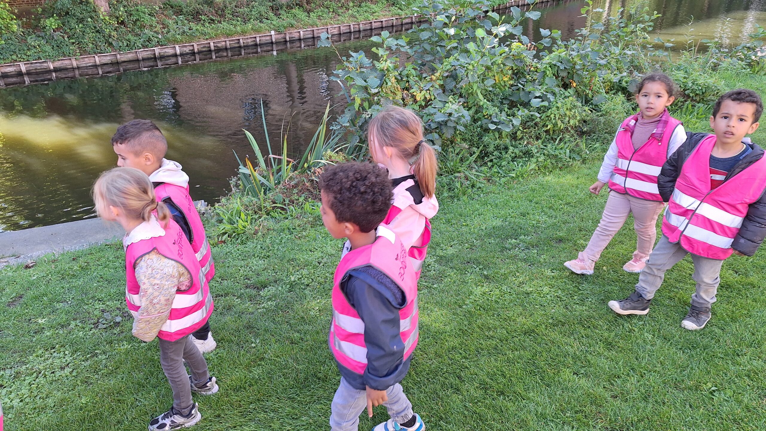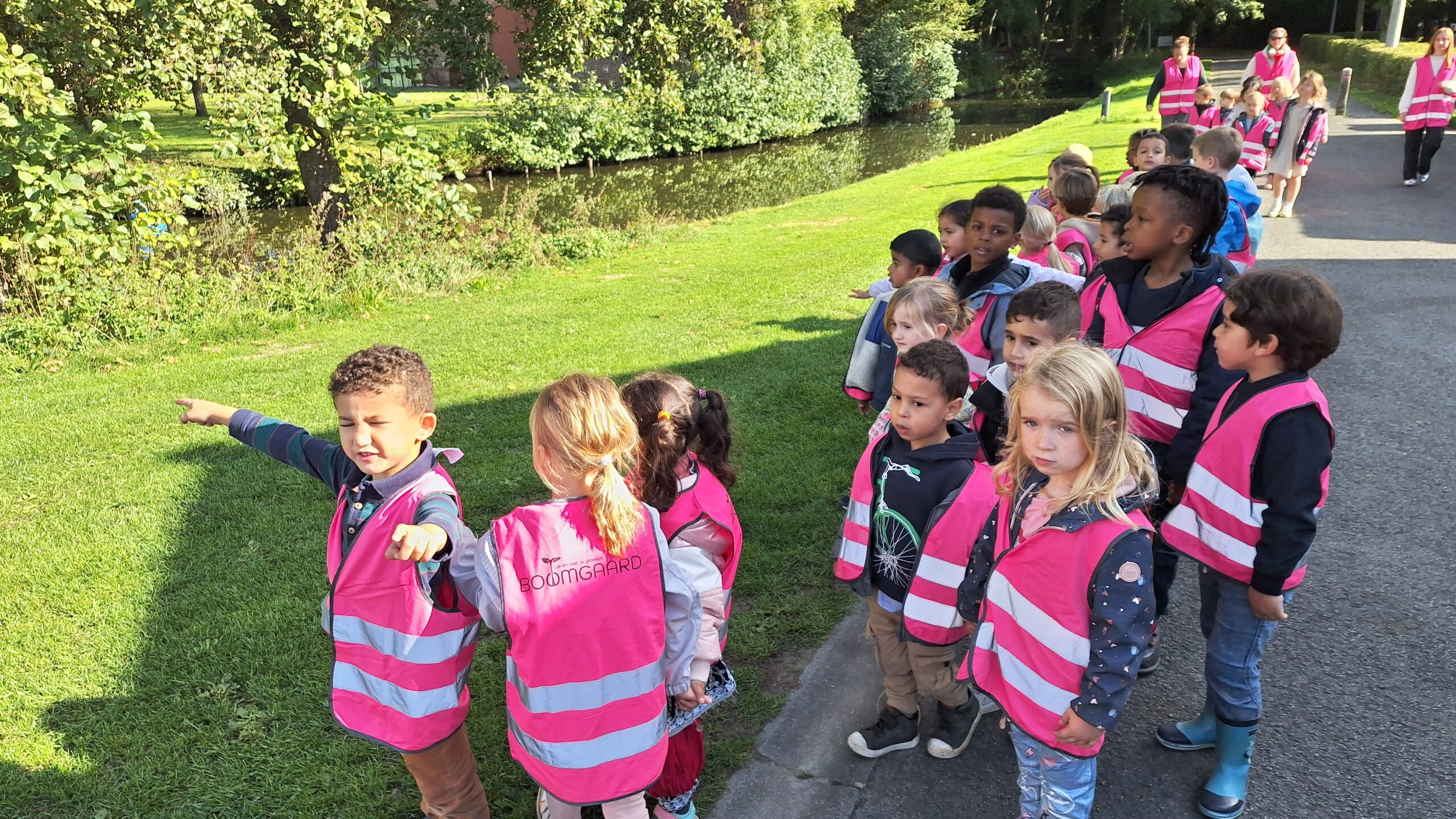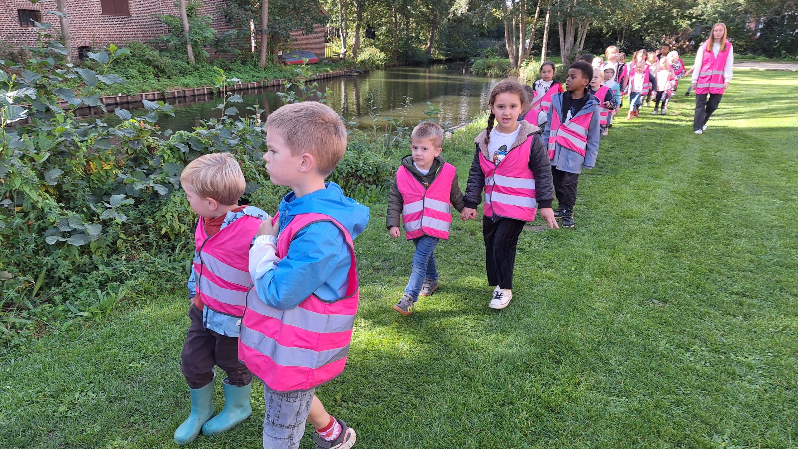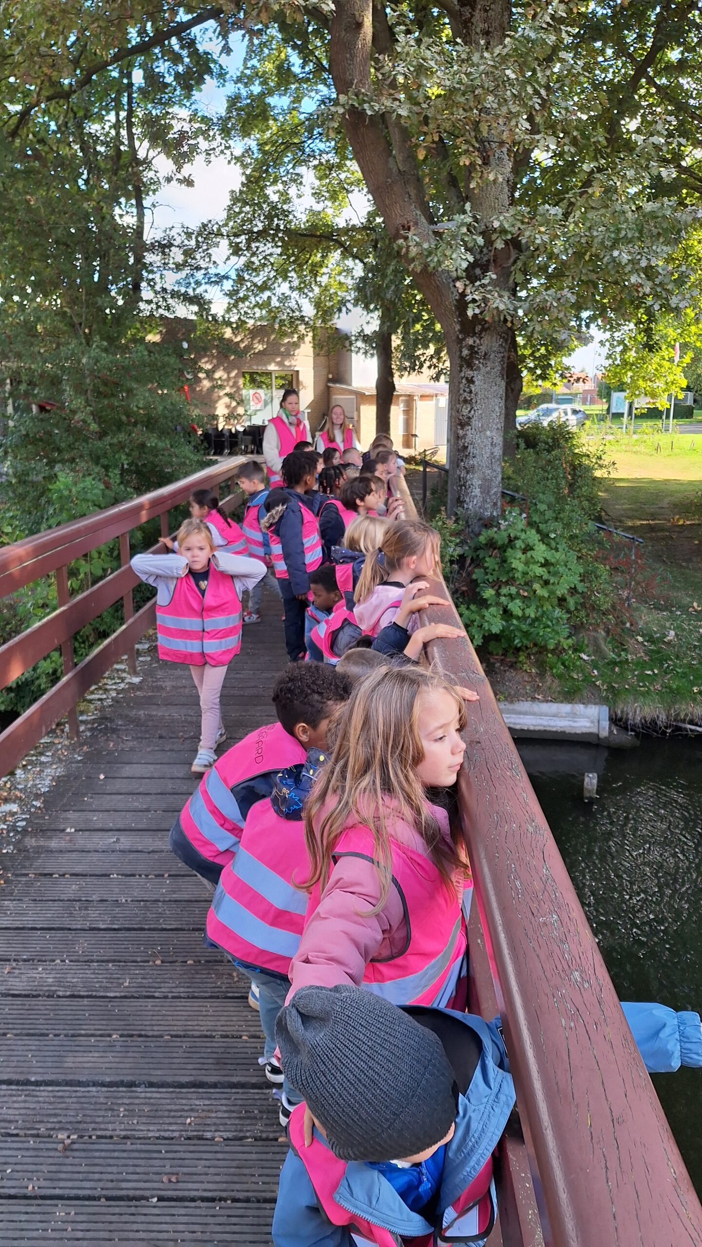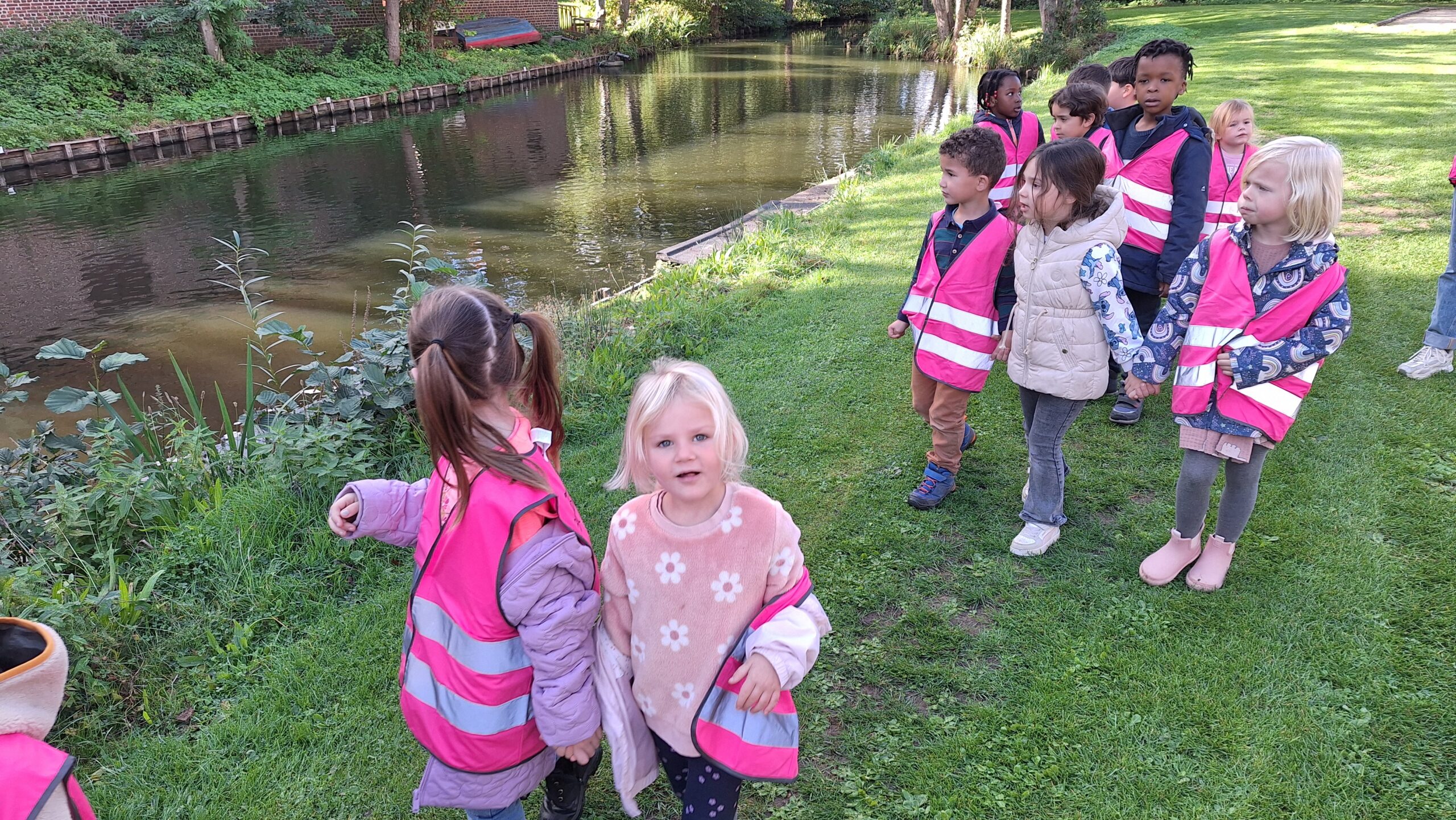 Waar de kleuters het meest naar uitkeken was onze uitstap op dinsdag naar een echte vijver. De kinderen keken vol verwondering naar wat er allemaal te zien was: eenden, planten, water en een gans. Zo werd het thema nog echter en konden ze zelf ervaren hoe een vijver er in het echt uitziet.