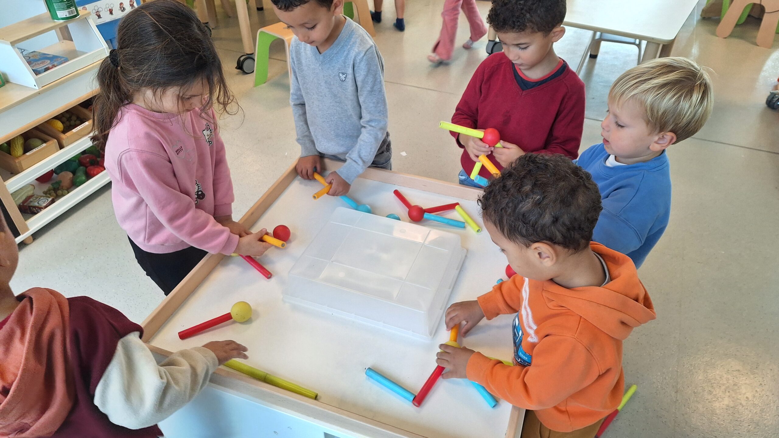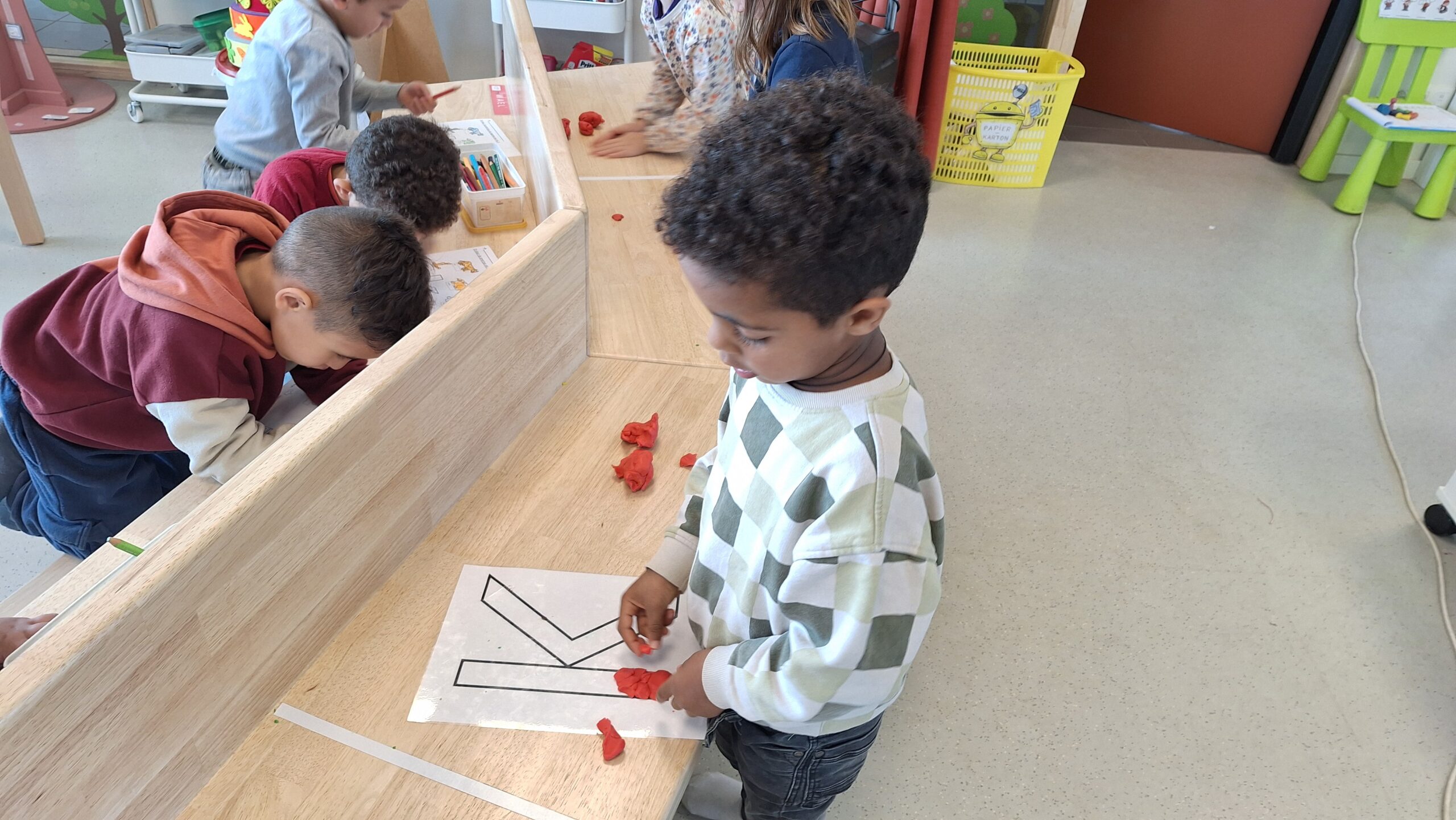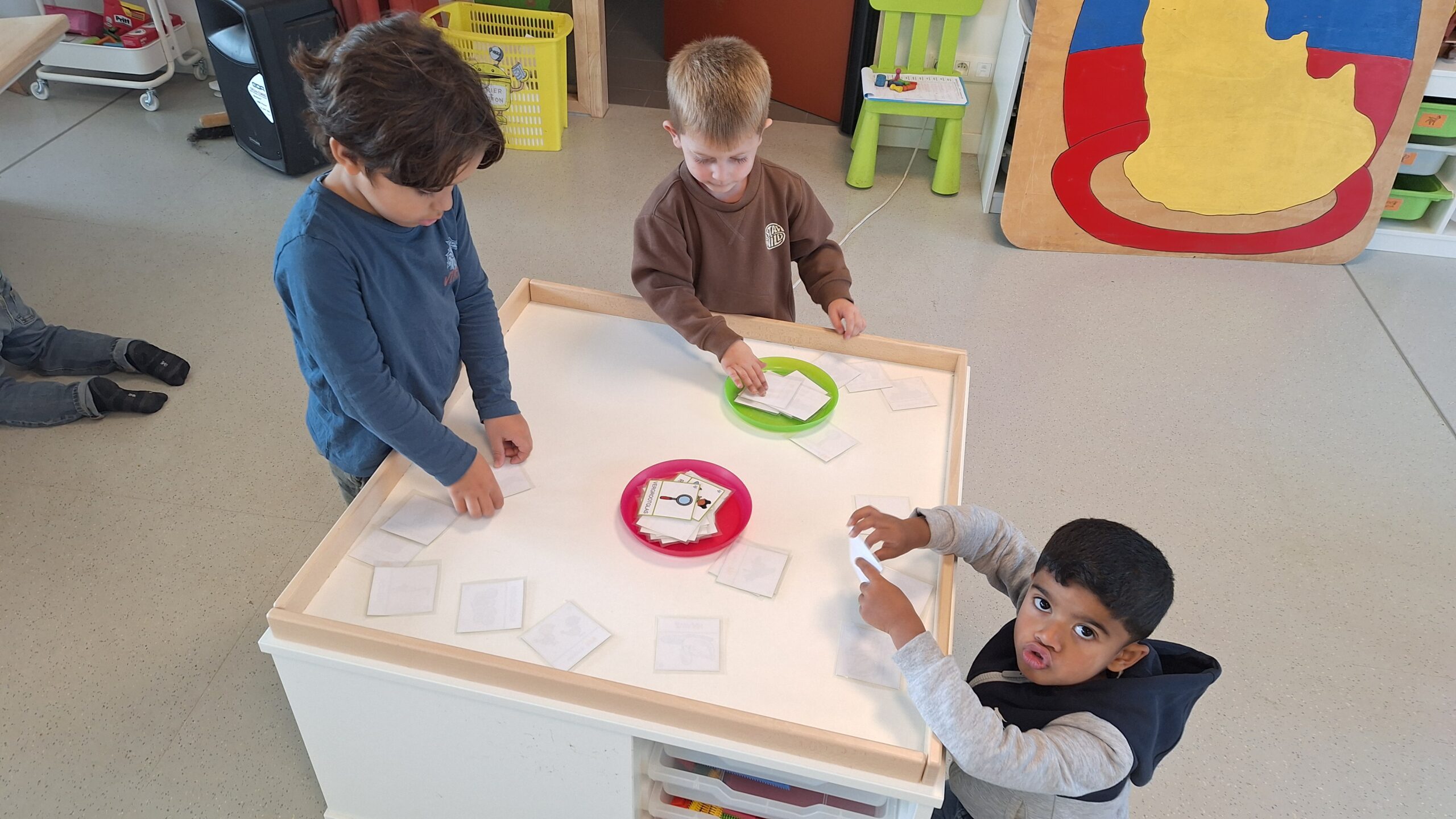 We hebben de vormen nog eens herhaald met een spelletje. De kinderen konden vierkanten, rechthoeken en cirkels benoemen en herkennen. Al spelend oefenden ze zo opnieuw hun kennis en merkten we dat het steeds beter lukt.