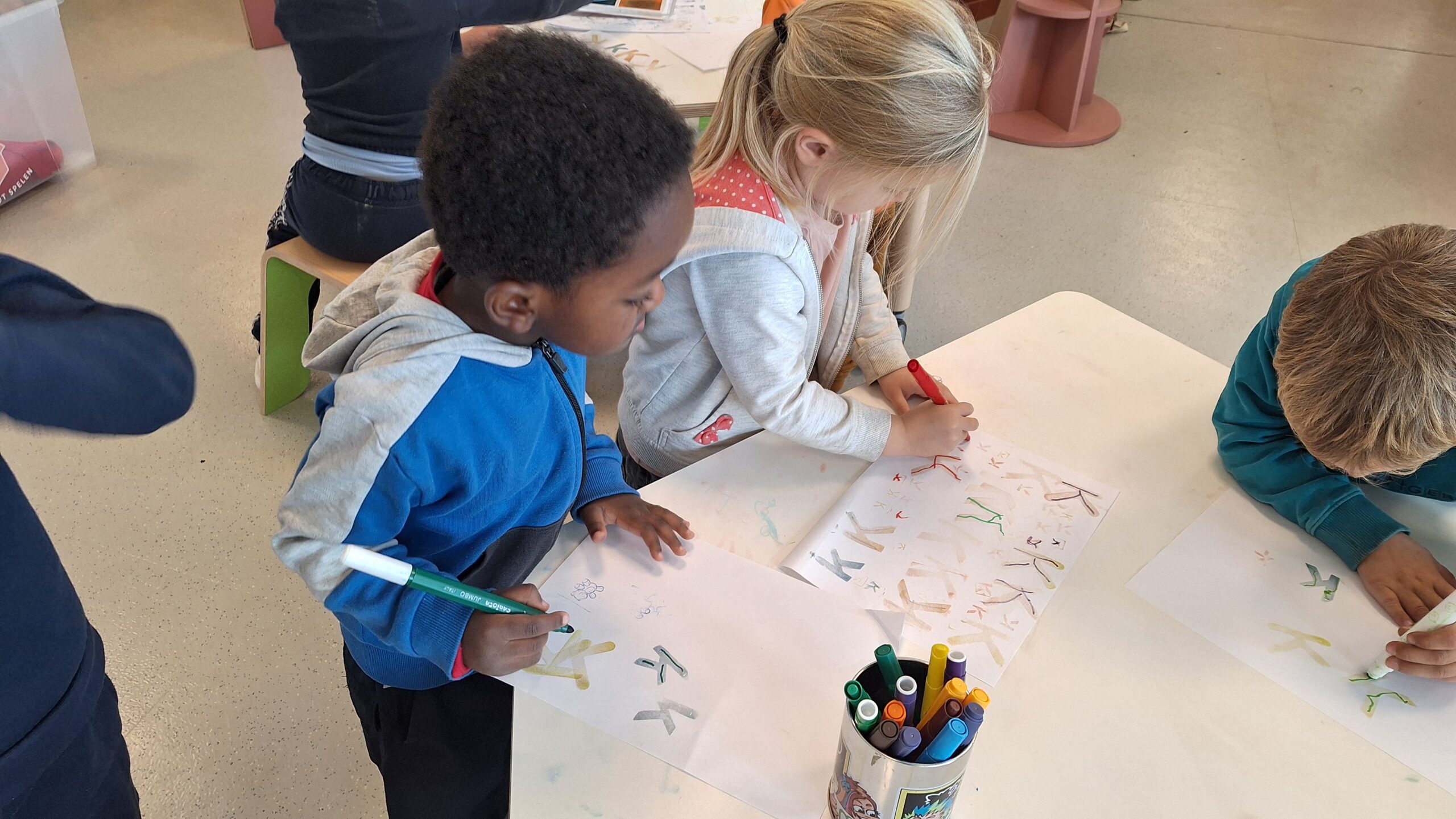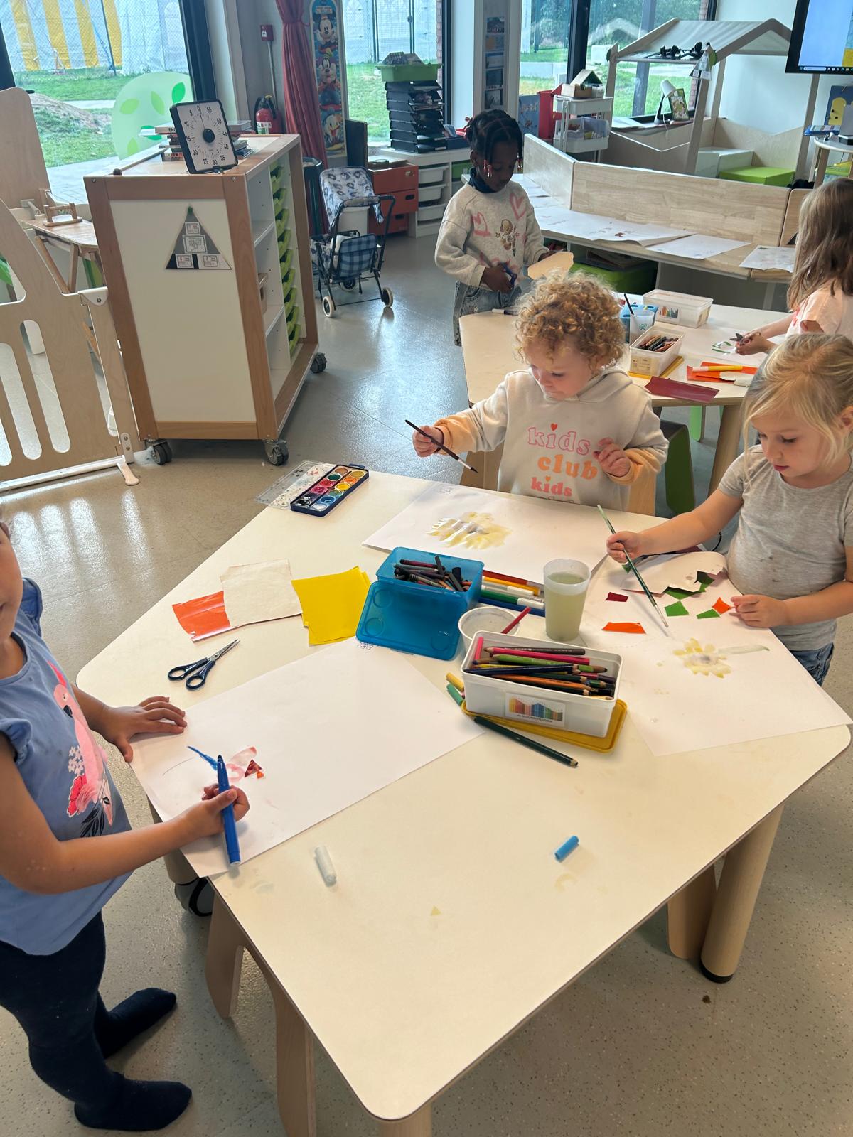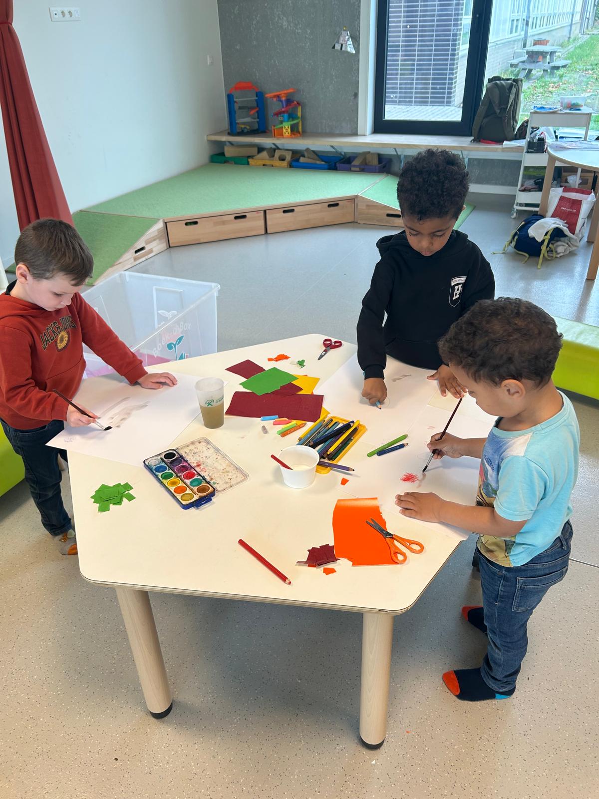 Na al dat ontdekken gingen de kleuters zelf aan de slag. Ze schilderden, stempelden, drupten en experimenteerden erop los. Het resultaat is een prachtige verzameling kunstwerken, elk uniek op zijn eigen manier.