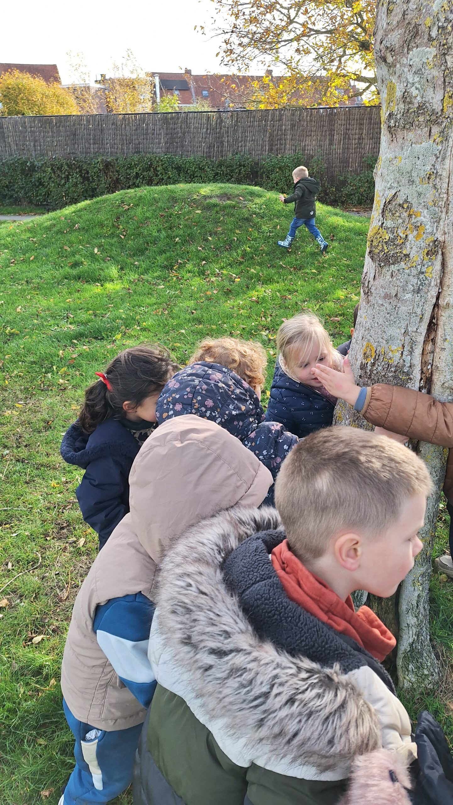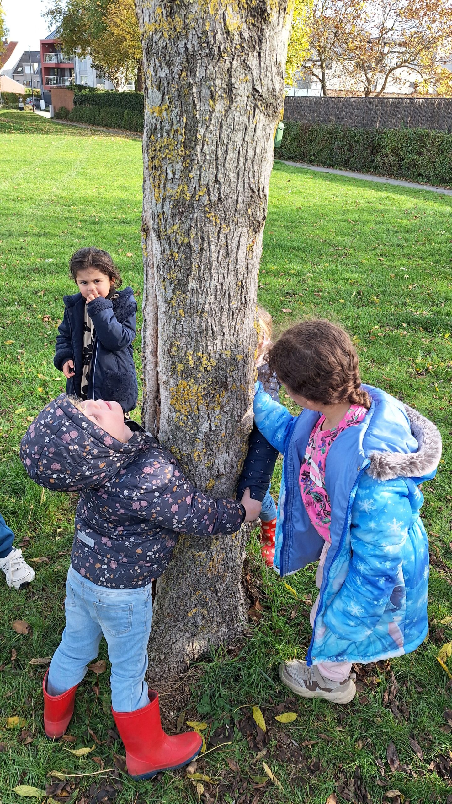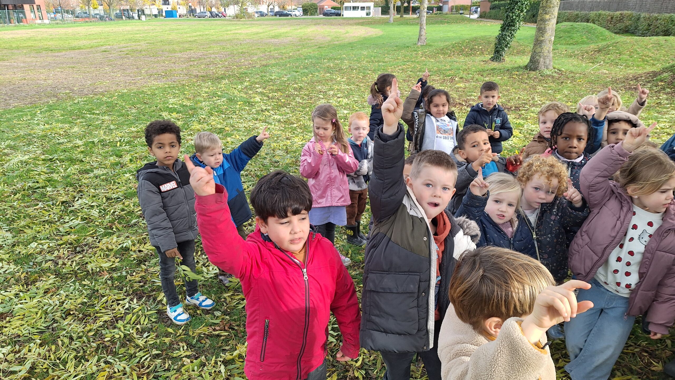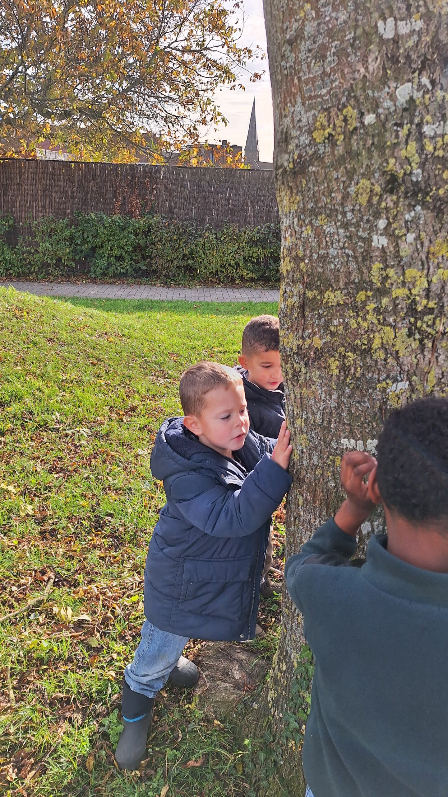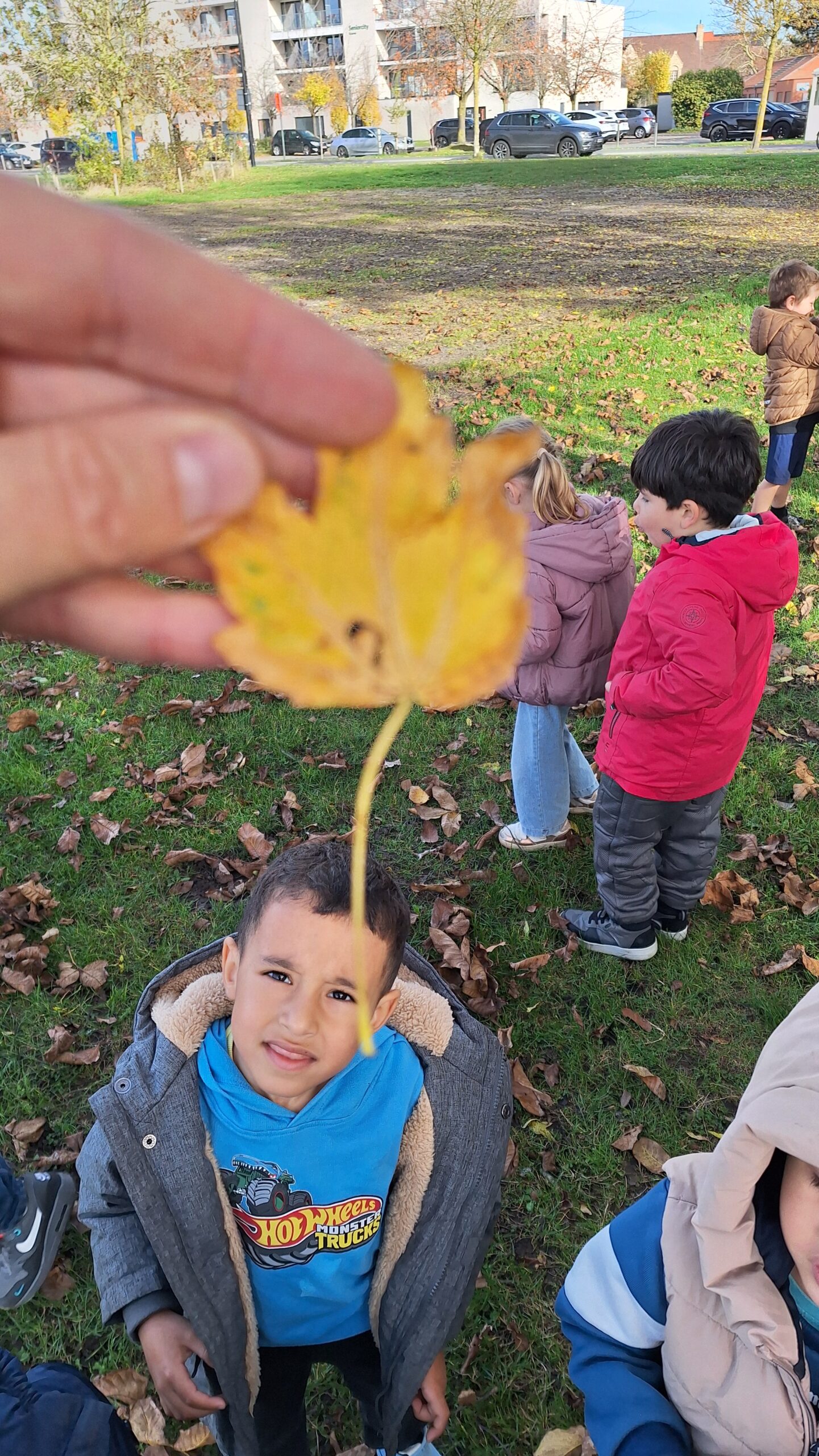Op dinsdag trokken we naar buiten om bomen van dichtbij te bekijken. We zagen hoe de bladeren van kleur veranderen, hoe sommige blaadjes nog vasthangen en andere al op de grond liggen. We spraken over stam, takken, bladeren en wortels. Een echte ontdekkingstocht in onze eigen omgeving!
