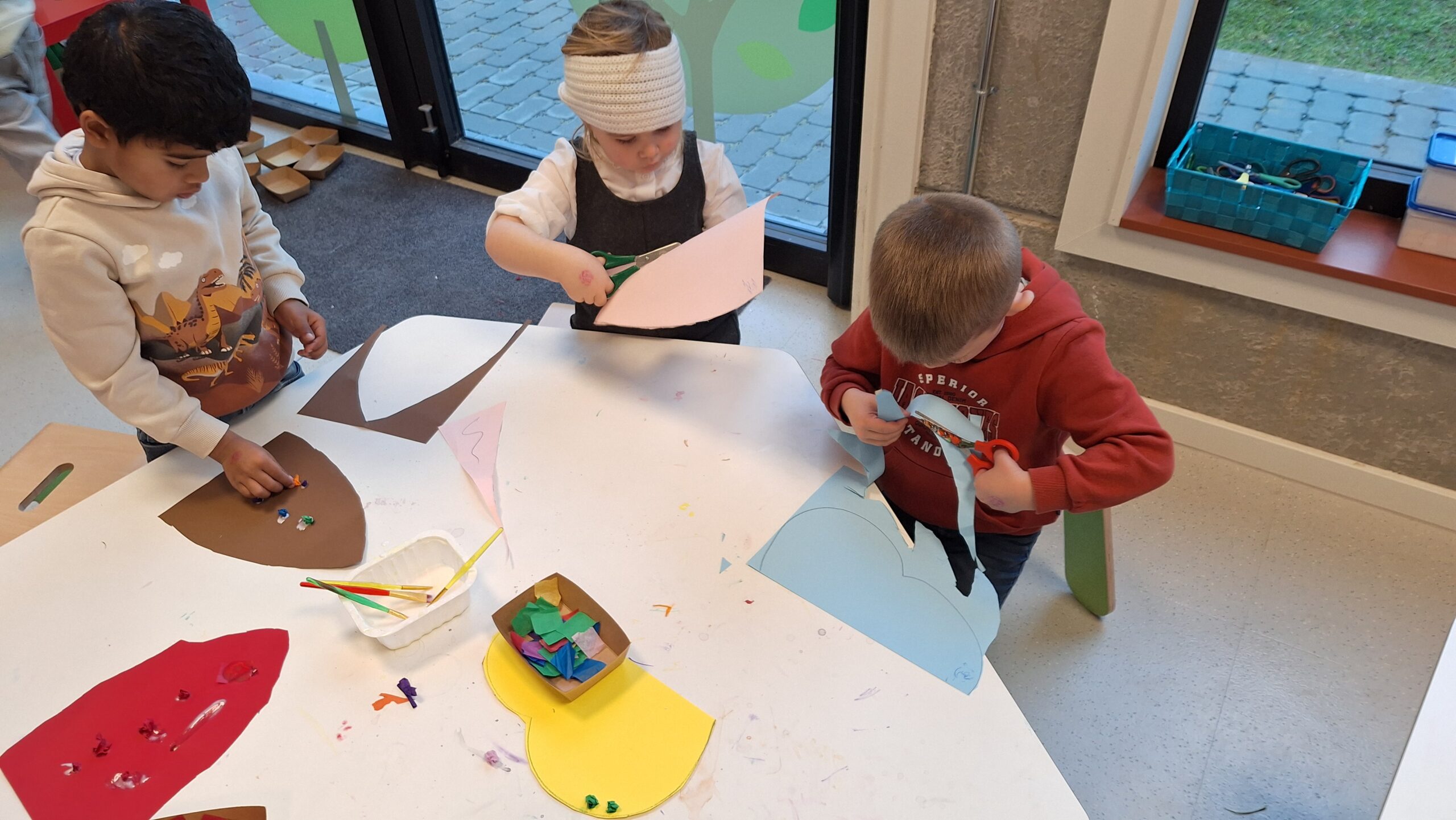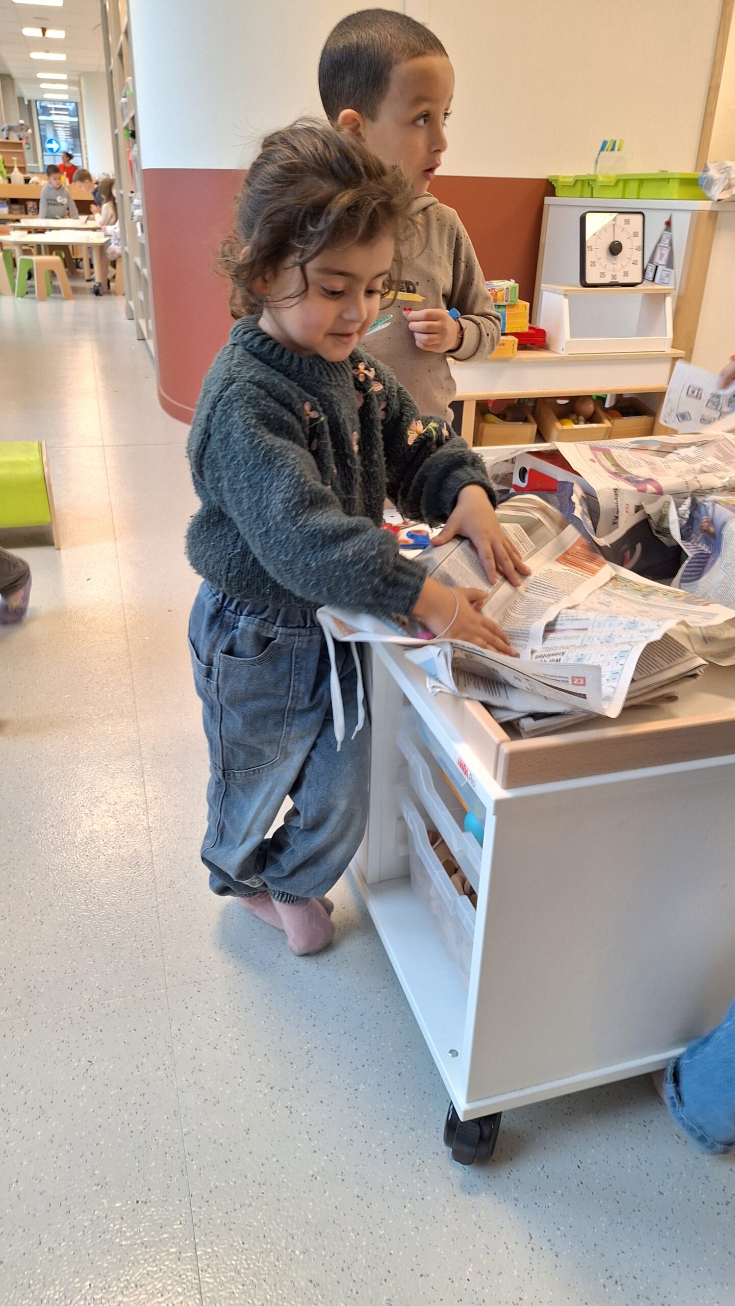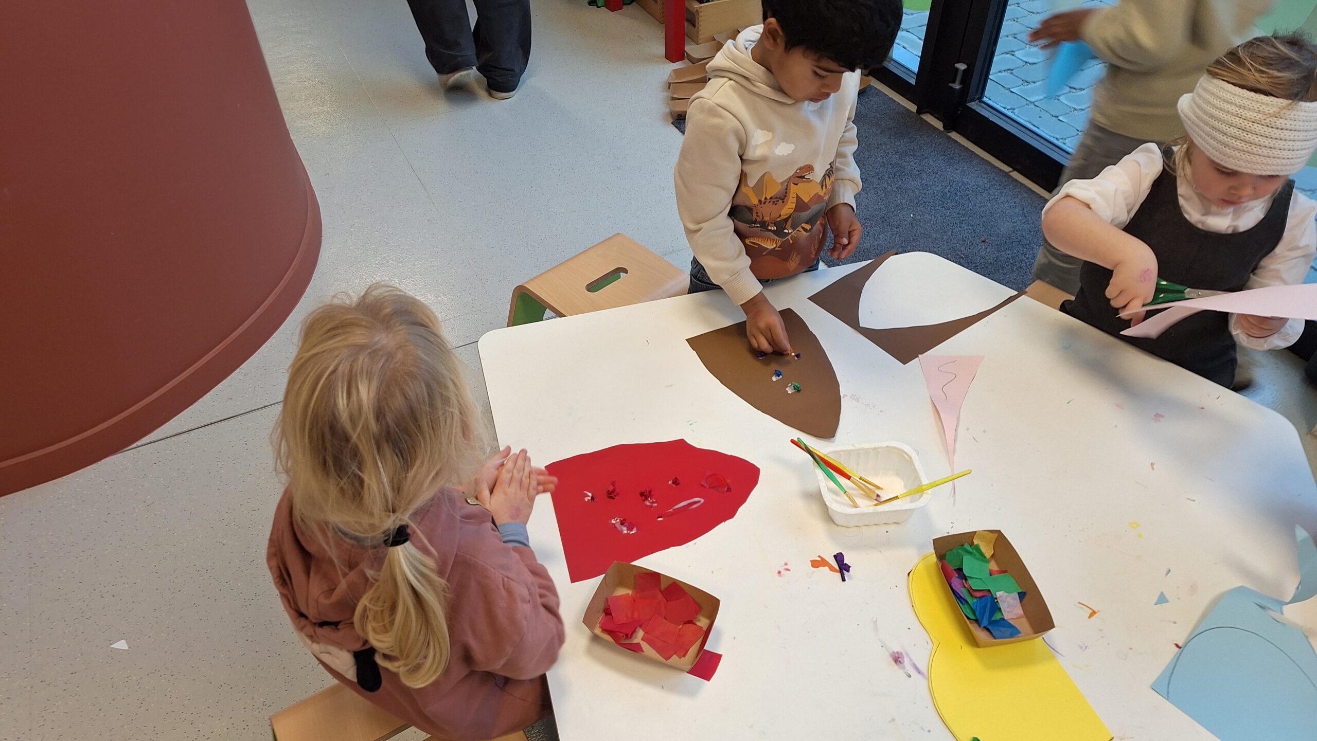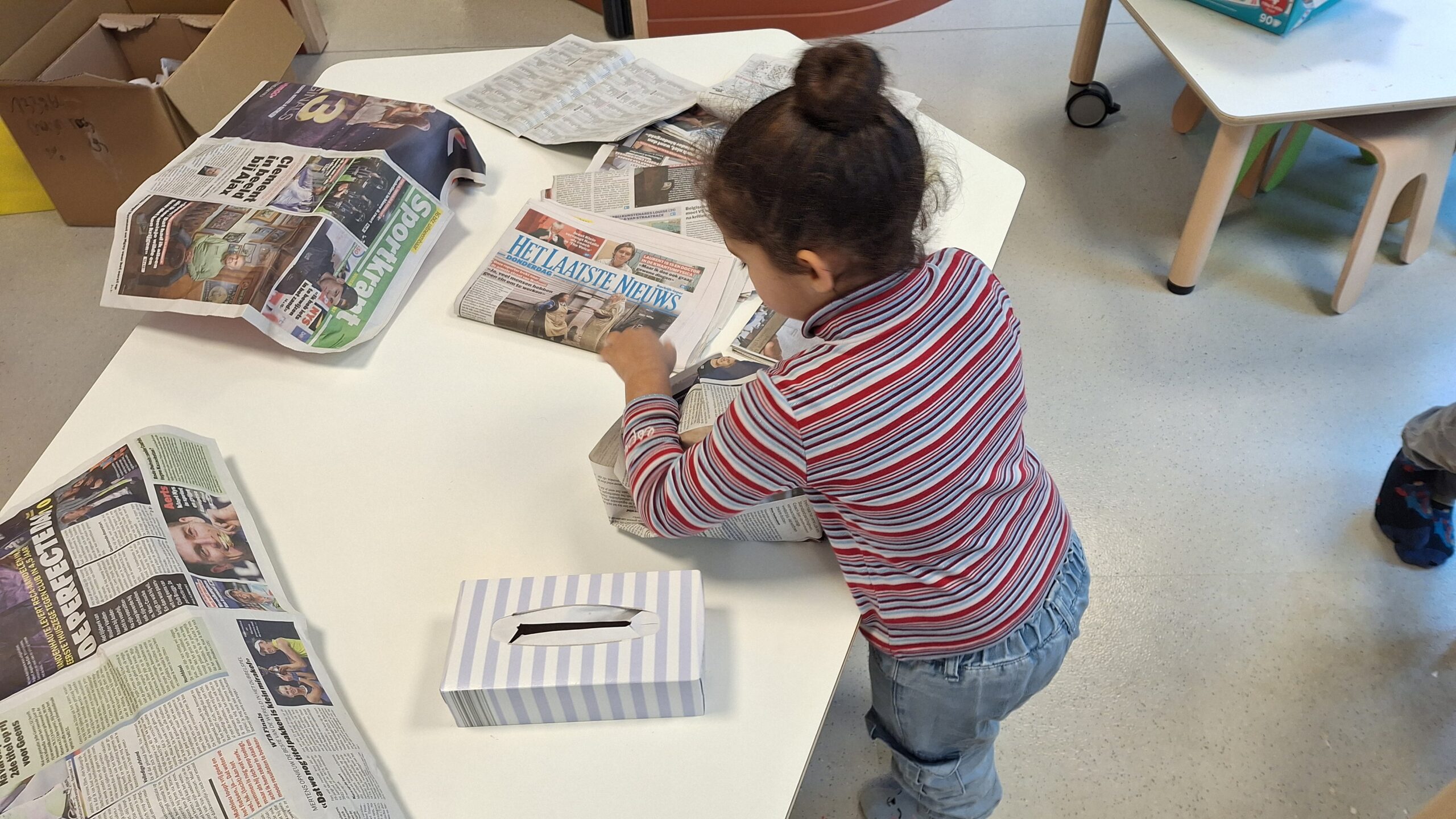 Deze week mochten de kleuters cadeautjes verpakken, met krantenpapier en plakband gingen ze enthousiast aan de slag — wat een fijne oefening voor hun fijne motoriek én fantasie!