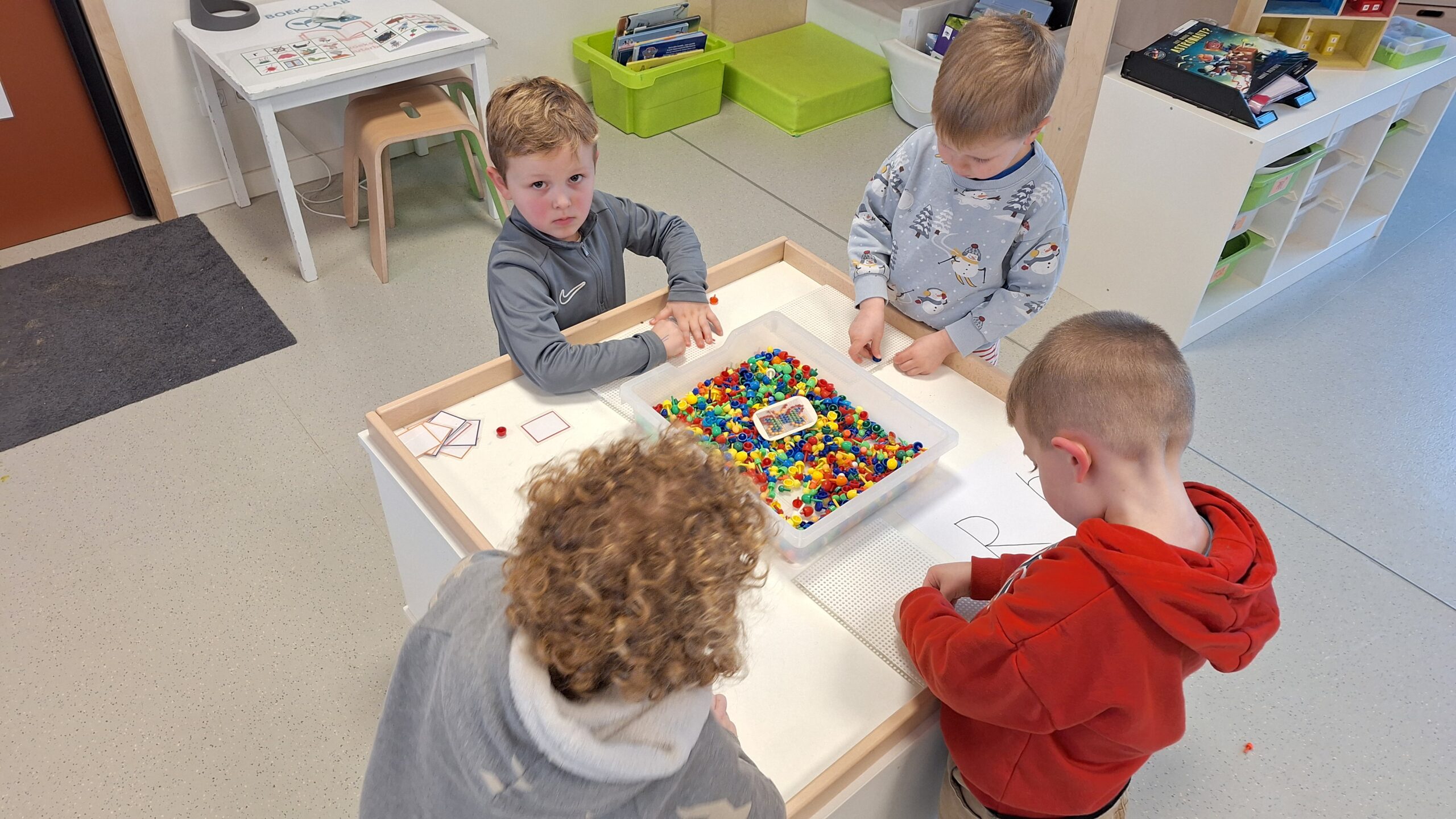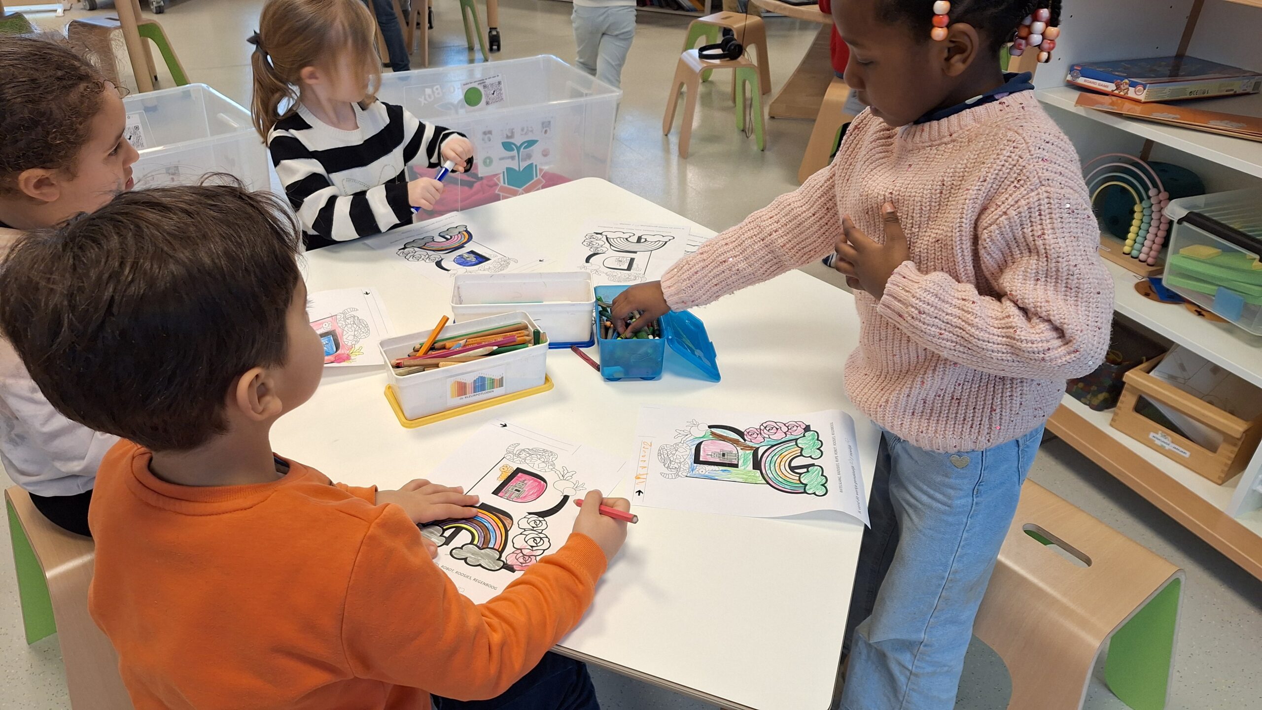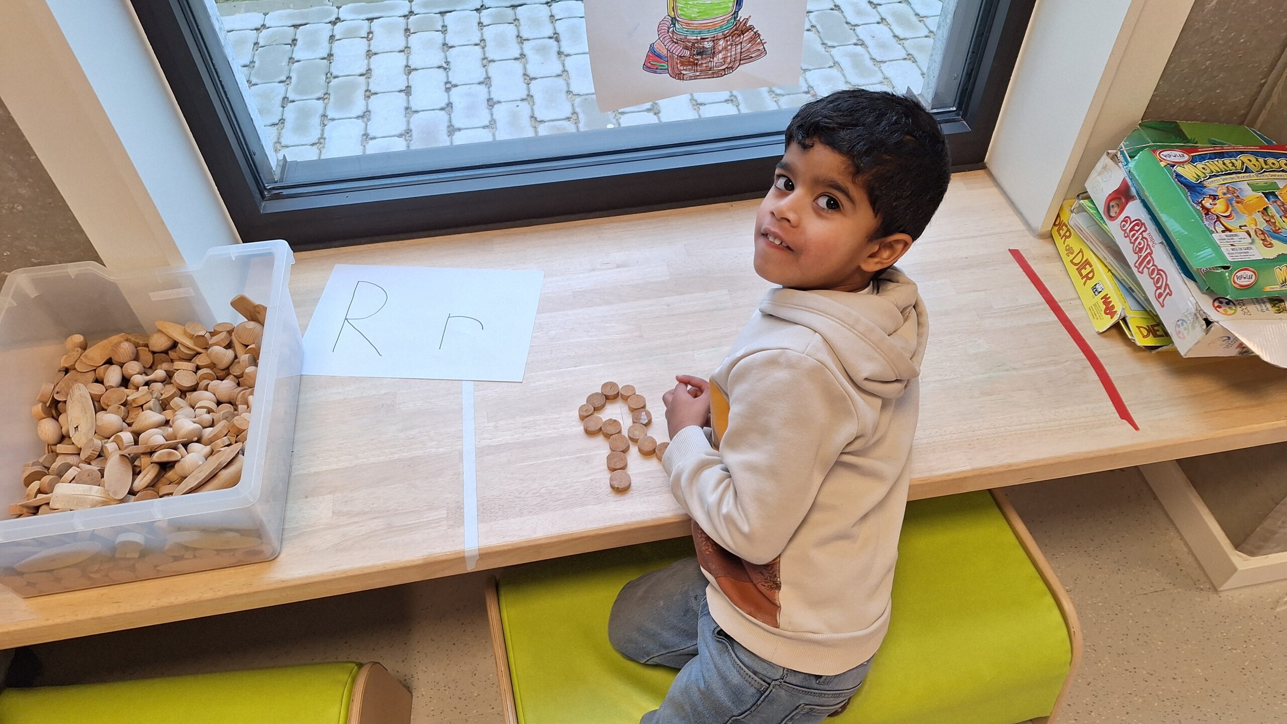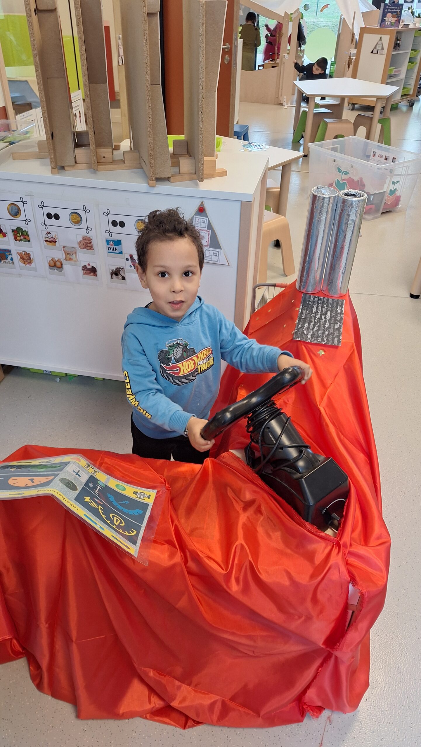 Daarnaast werkten we rond plaatsbepaling in de ruimte. We oefenden begrippen zoals boven, onder, naast, voor en achter. Waar zweeft de astronaut? Welke planeet staat naast de raket? Dat was soms even nadenken, maar het lukte al heel goed!