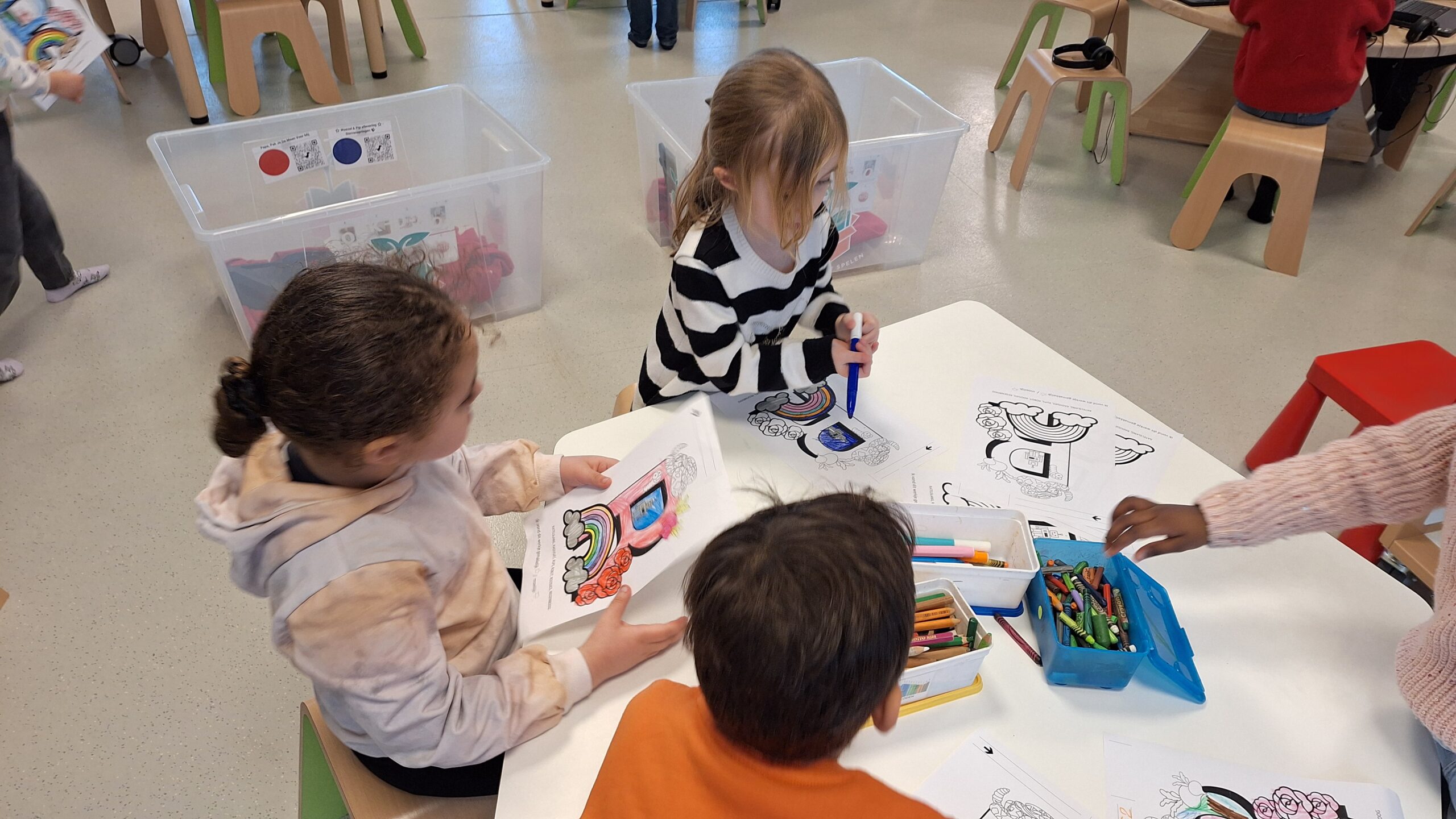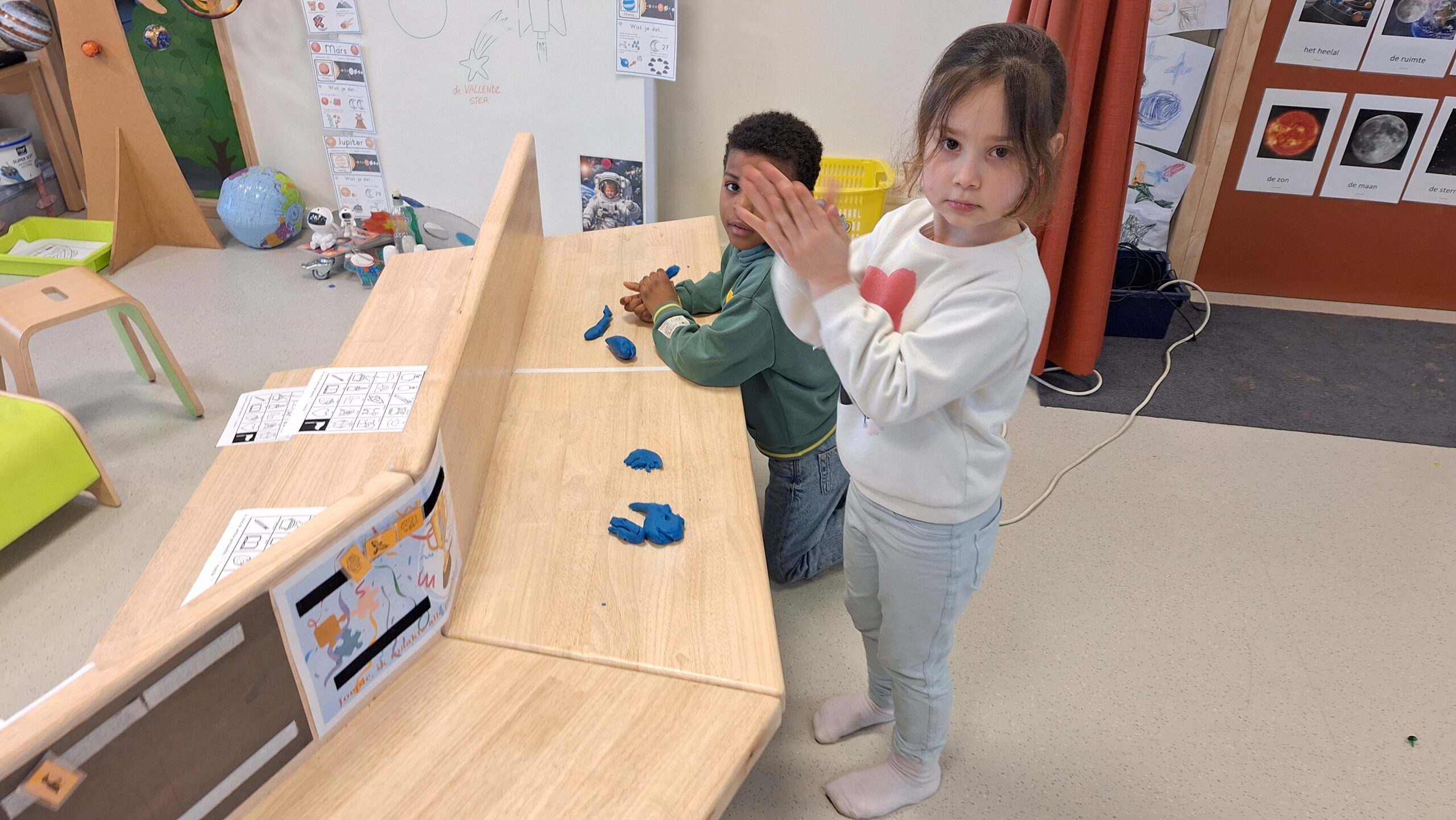 De kleuters ontdekten dat sommige planeten heel groot zijn, dat Saturnus mooie ringen heeft en dat het in de ruimte heel koud kan zijn.